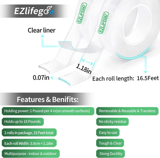 EZlifego Double Sided Tape Heavy Duty(Extra Large, Pack of 2, Total 396 Inch), Nano Double Sided Adhesive Tape, Clear Mounting Tape Picture Hanging Strips, Removable Wall Tape Sticky Poster Tape Decor